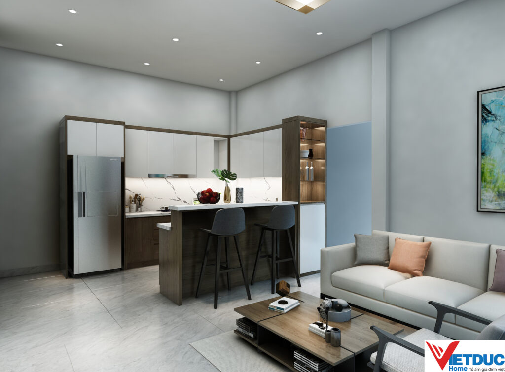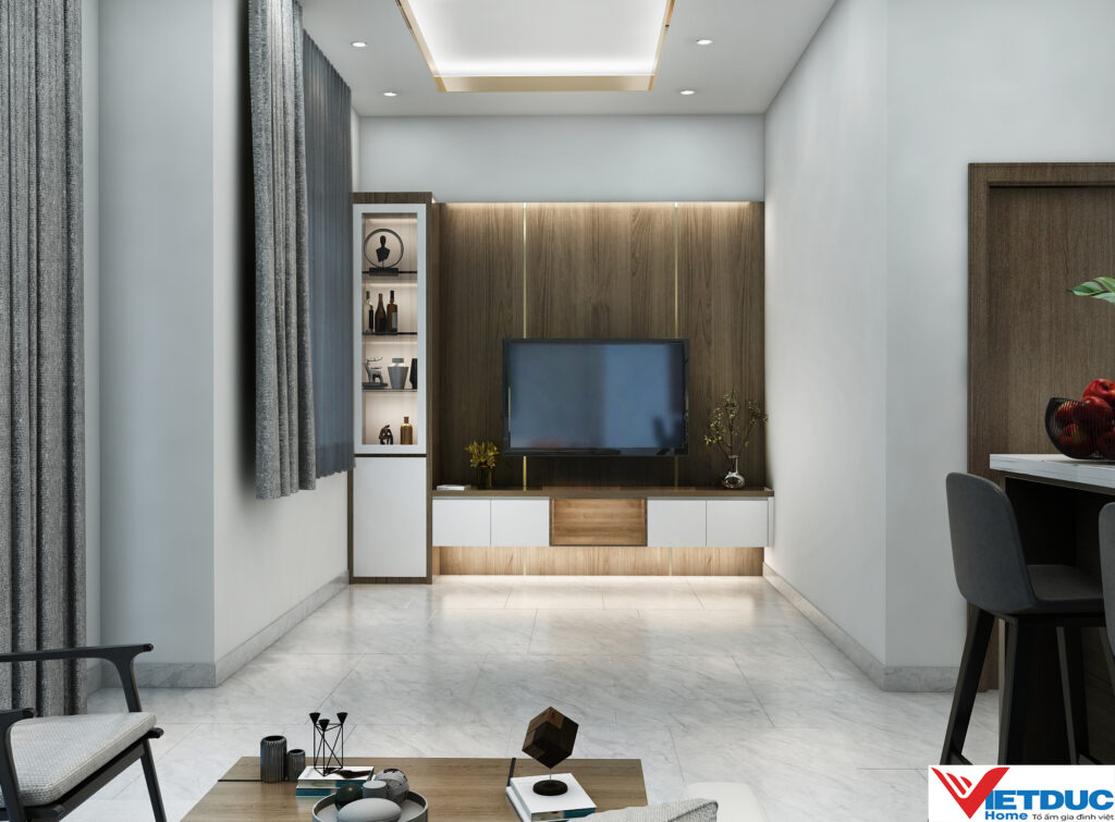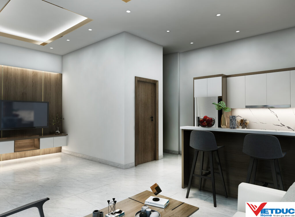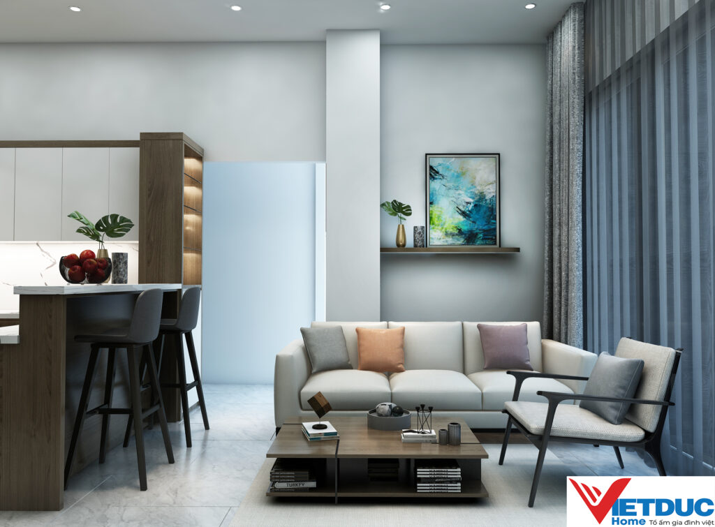 Hiểu được bài toán không gian của gia chủ, đội ngũ kiến trúc sư Việt Đức Home đã khéo léo lựa chọn phong cách hiện đại, tối giản làm chủ đạo. Bảng màu trung tính với sắc trắng, xám, be chủ đạo kết hợp cùng ánh sáng tự nhiên chan hòa tạo cảm giác rộng rãi và thoáng đãng hơn cho căn hộ.
