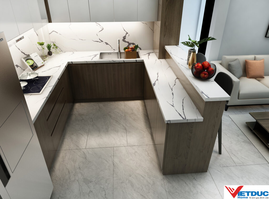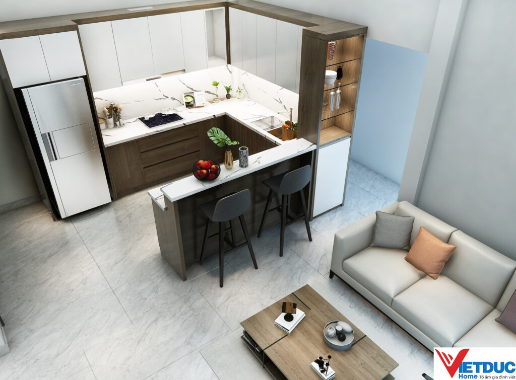 Mỗi chi tiết trong căn hộ đều được tính toán kỹ lưỡng để tối ưu hóa công năng sử dụng. Phòng khách liền kề bếp tạo không gian mở, giúp kết nối các thành viên trong gia đình. Hệ thống tủ bếp chữ L hiện đại, tiện dụng, tích hợp đầy đủ thiết bị hiện đại đáp ứng nhu cầu nấu nướng của gia chủ.