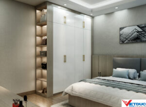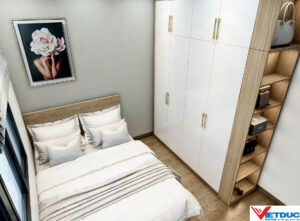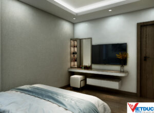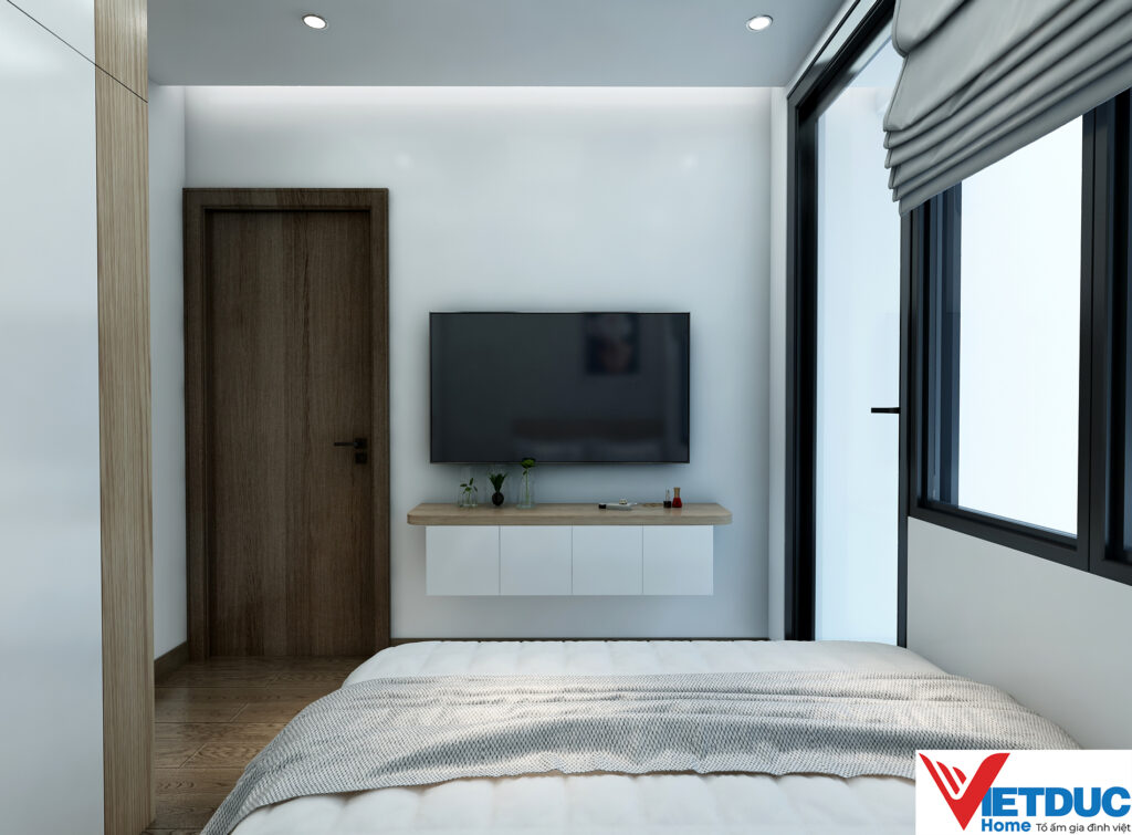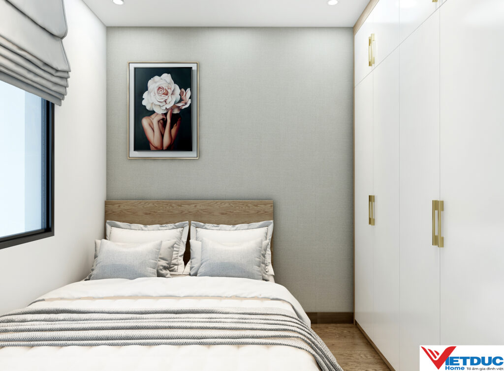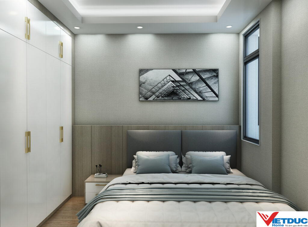 Phòng ngủ được thiết kế tối giản với gam màu sáng, tập trung vào công năng nghỉ ngơi. Tủ quần áo âm tường kết hợp kệ trang trí giúp tiết kiệm diện tích mà vẫn đảm bảo tính thẩm mỹ.
