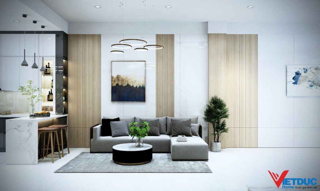 Phòng khách với màu trắng làm chủ đạo được trang trí bằng những chi tiết gỗ công nghiệp màu kem, tạo ra sự đồng nhất và hài hòa cho không gian. Đồng thời, việc sử dụng đèn chiếu sáng tinh tế và bố trí các cây cối xanh tạo nên không gian sống gần gũi với thiên nhiên.