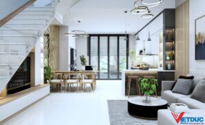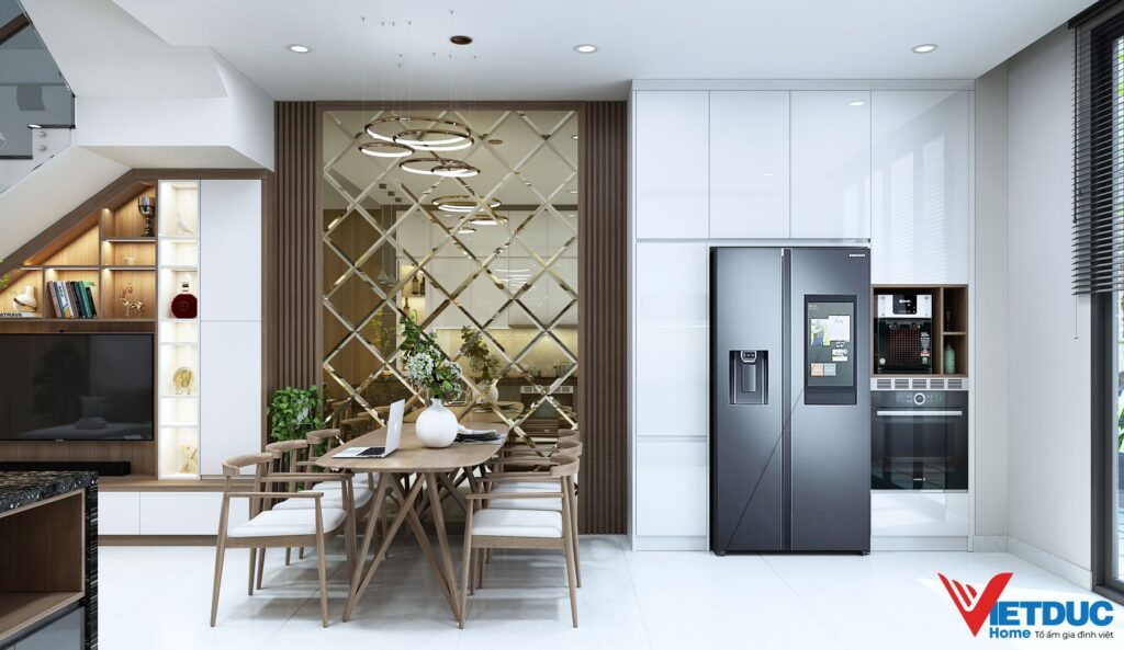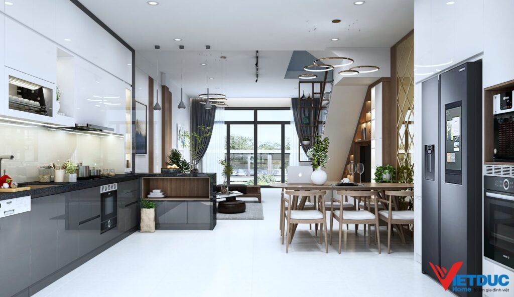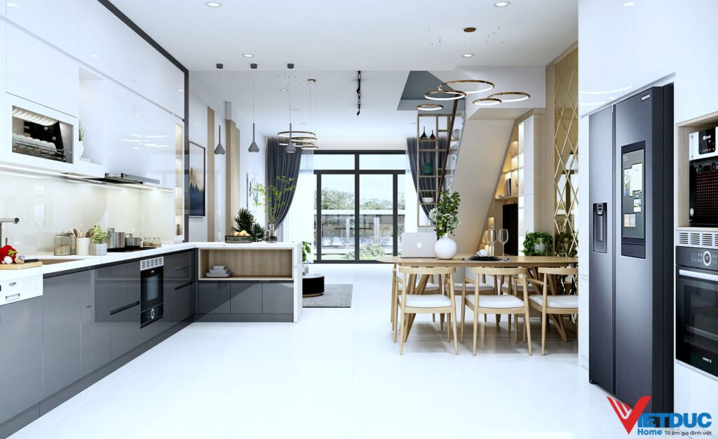 Bên cạnh đó, không gian bếp và phòng ăn được thiết kế với kiểu dáng hiện đại, tạo nên sự tiện nghi và thoải mái cho người sử dụng. Việc sử dụng tông màu trắng làm chủ đạo cùng với những chi tiết gỗ công nghiệp màu kem tinh tế đã giúp không gian trở nên rộng rãi và thoáng đãng.