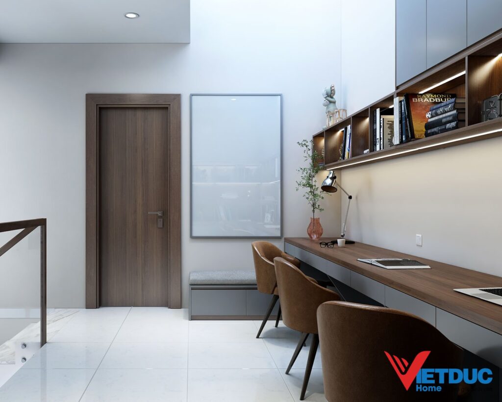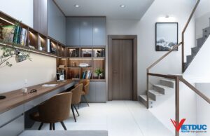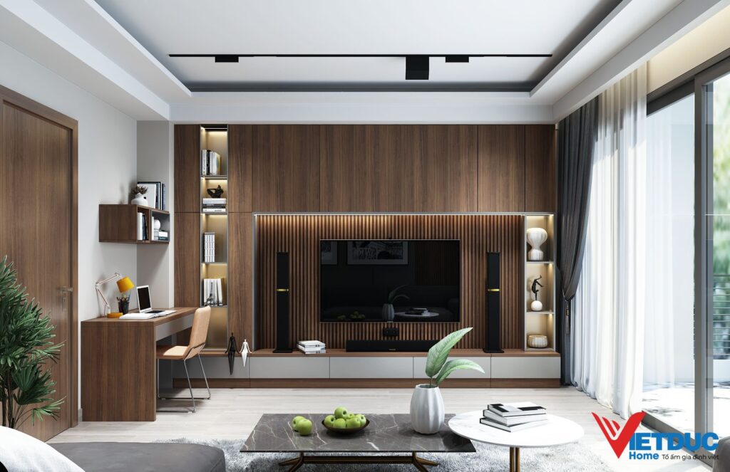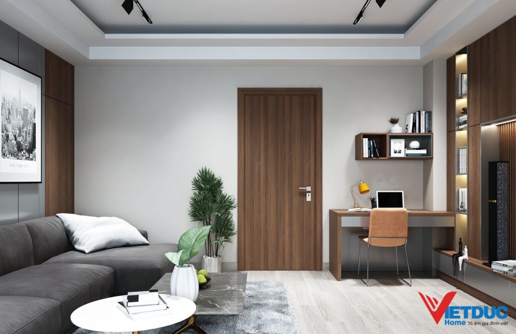 Phòng khách cùng với không gian làm việc được tô điểm bằng gam màu hạt dẻ trầm ấm, tạo nên cảm giác ấm áp và dễ chịu cho người dùng. Với việc sử dụng những chi tiết gỗ công nghiệp màu kem tinh tế, không gian trở nên trang nhã và đẳng cấp hơn.