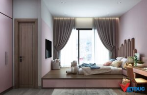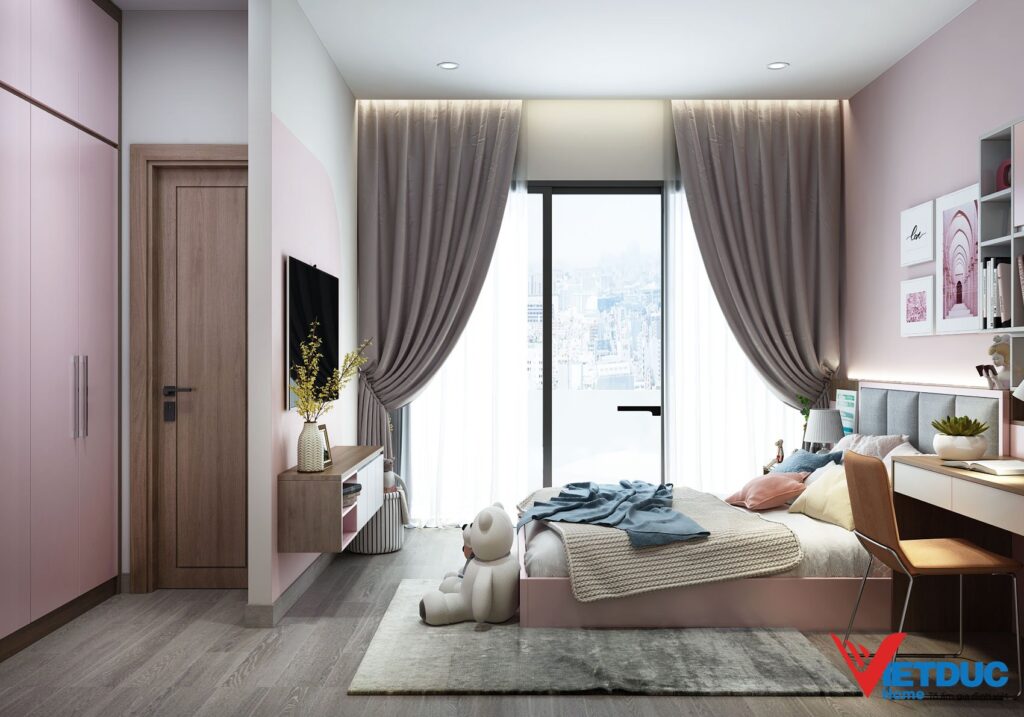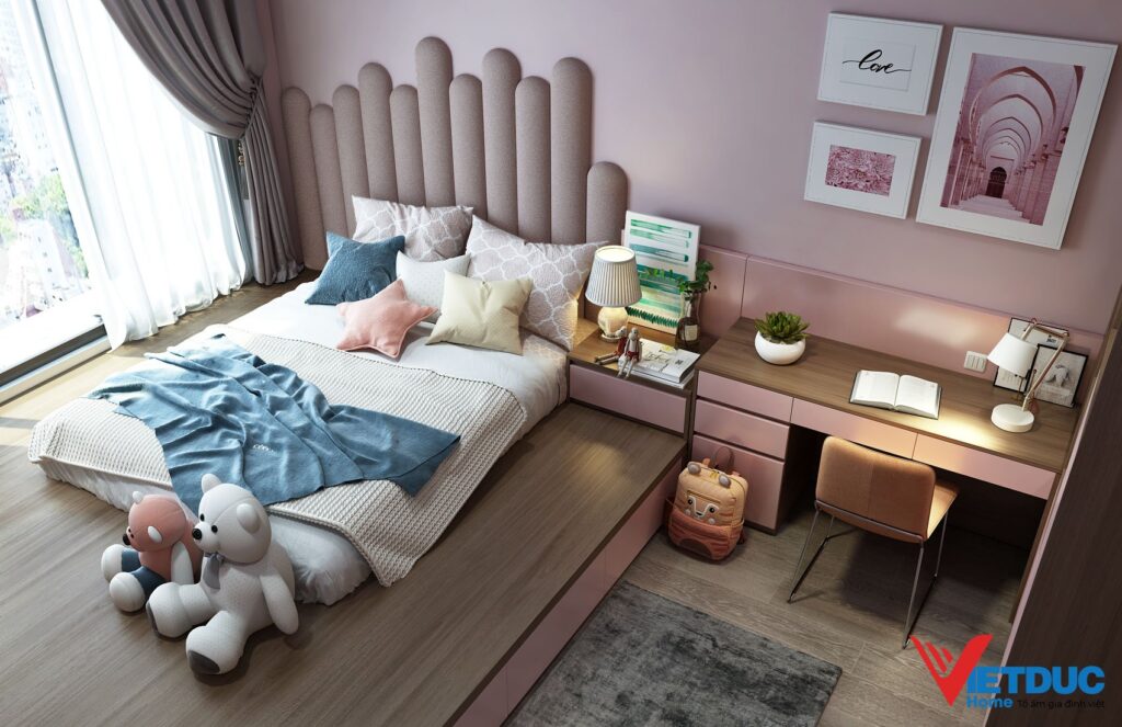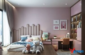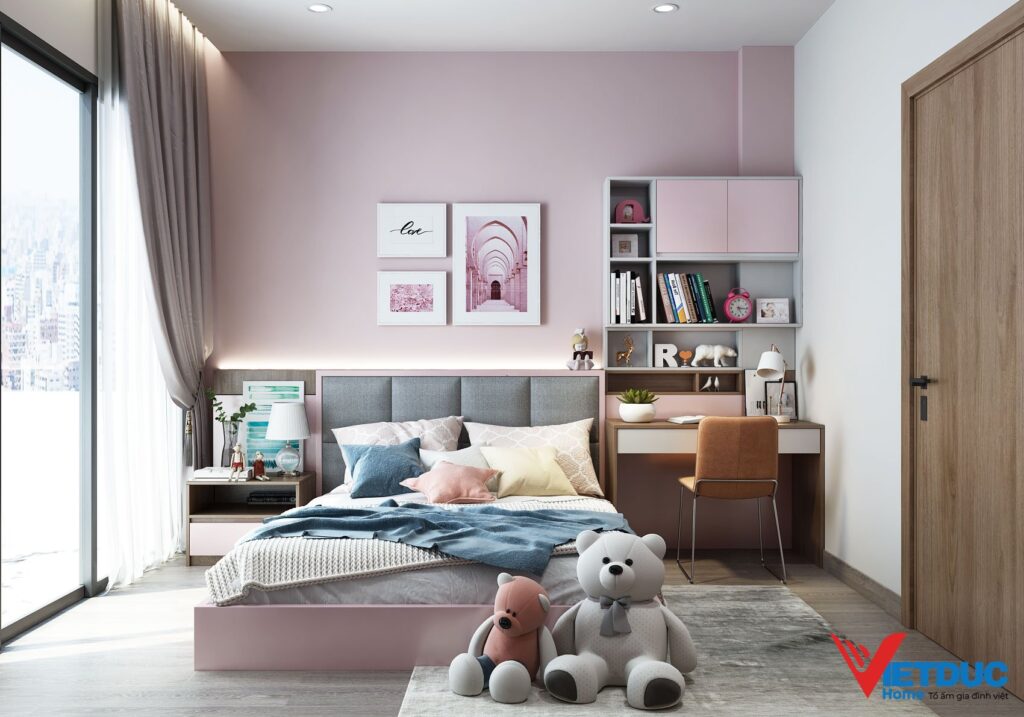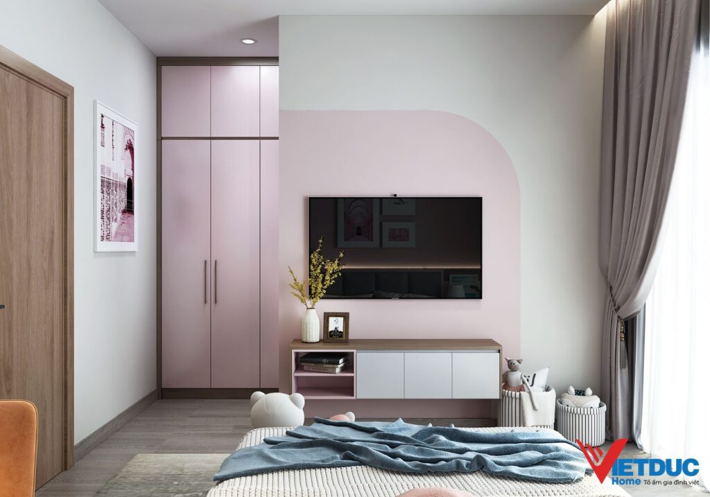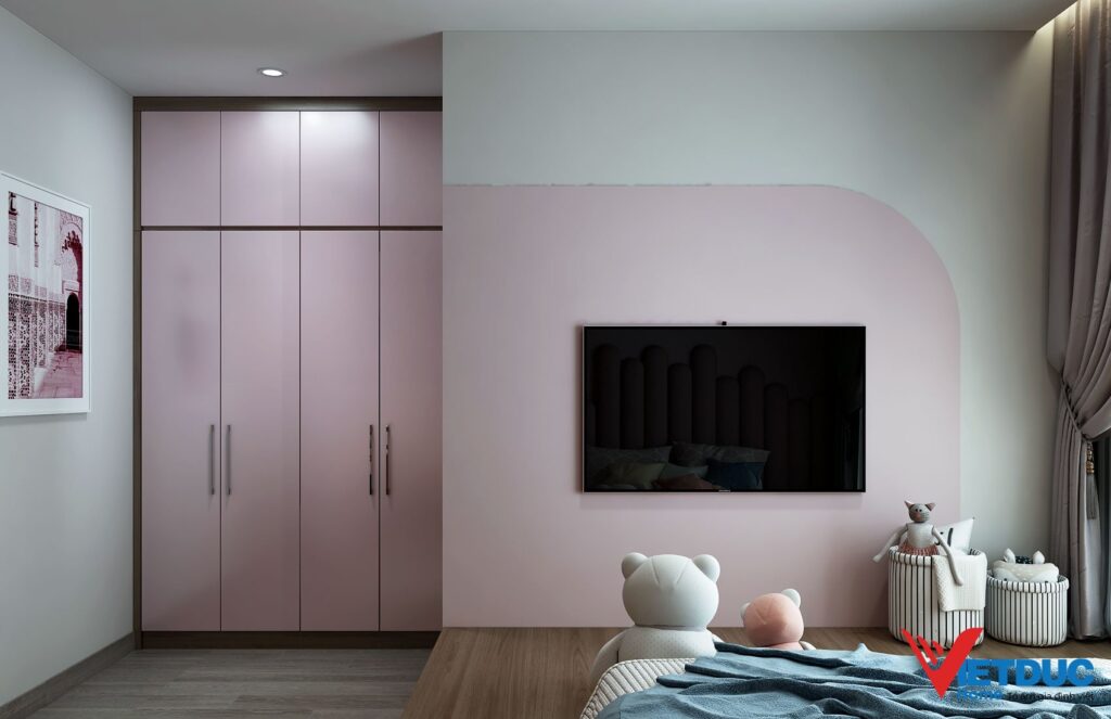 Không gian trẻ em được thiết kế đơn giản nhưng vô cùng sinh động với các món đồ nội thất màu hồng tươi sáng, tạo nên một không gian trẻ trung và vui nhộn cho các bé. Việc sử dụng những món đồ nội thất gỗ công nghiệp màu hồng nhạt cũng giúp tạo nên sự đồng nhất và hài hòa cho không gian.