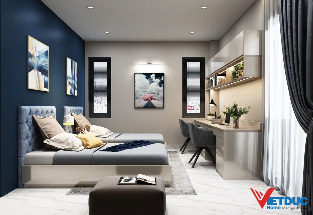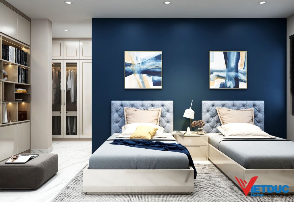 Tổng thể căn nhà được thiết kế với gam màu kem Tây và xanh navy tạo ra sự hài hòa và đồng nhất cho không gian sống. Sự sắp đặt tinh tế của các món đồ nội thất và các vật dụng phụ kiện là điểm nhấn tạo ra một không gian sống đẳng cấp, sang trọng và đầy tính thẩm mỹ. Những chi tiết tinh tế và sự kết hợp hài hòa của các màu sắc đã tạo nên một không gian sống đẳng cấp, đầy ấn tượng và đầy tính thẩm mỹ.