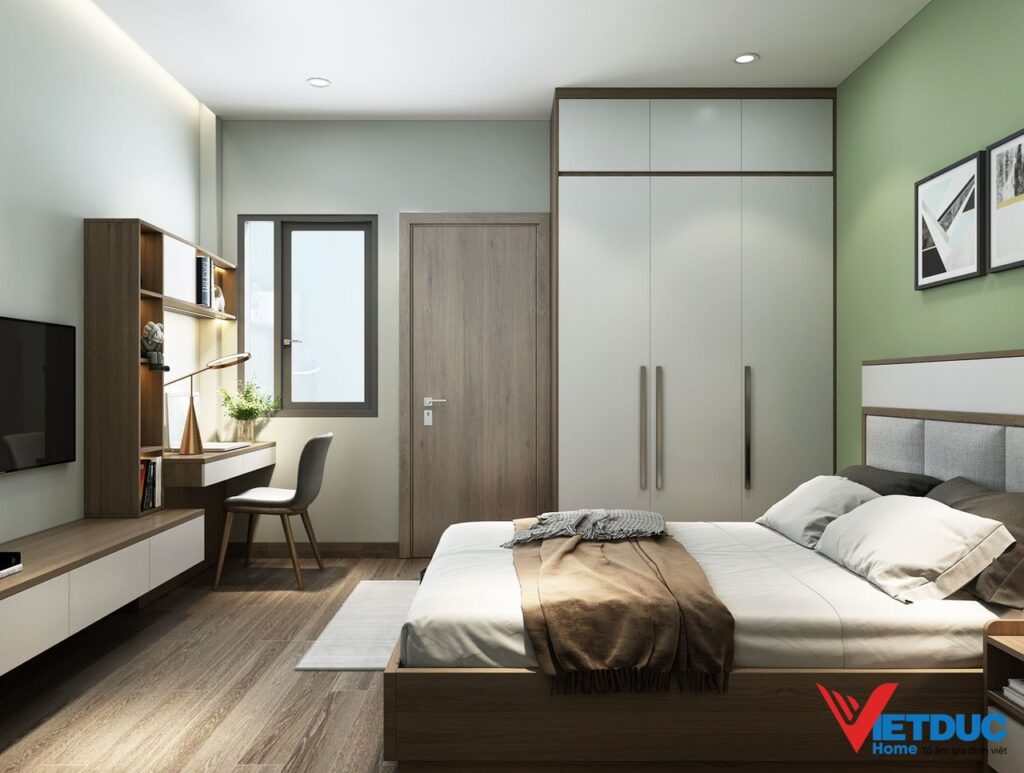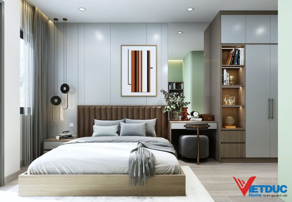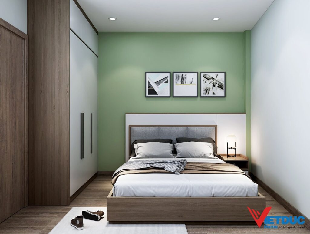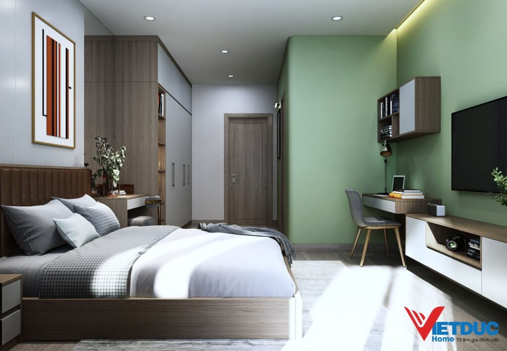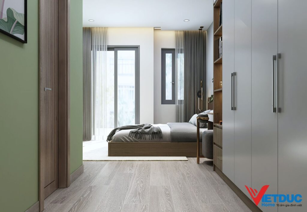 Hai phòng ngủ được thiết kế theo phong cách tối giản, tinh tế với gam màu xanh cốm chủ đạo, mang đến cảm giác thư giãn, dễ chịu. Mỗi phòng ngủ đều được bố trí hệ thống tủ quần áo, bàn làm việc, kệ trang trí… đáp ứng nhu cầu sử dụng của từng thành viên trong gia đình.