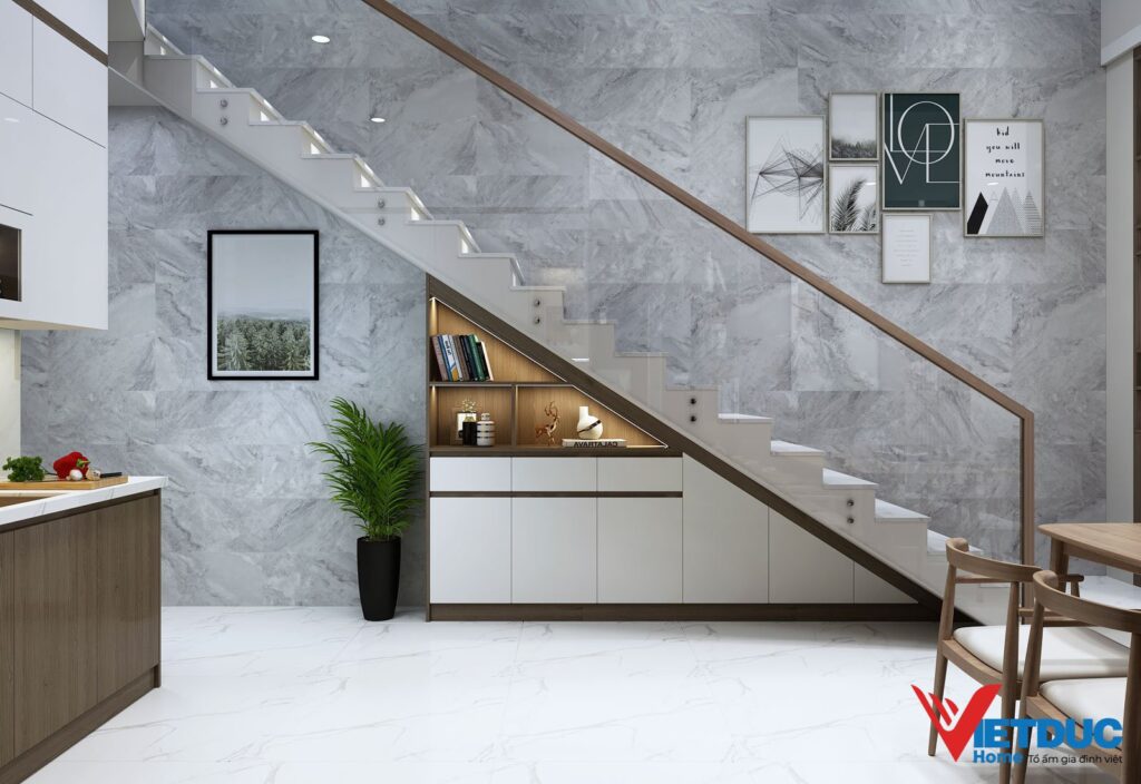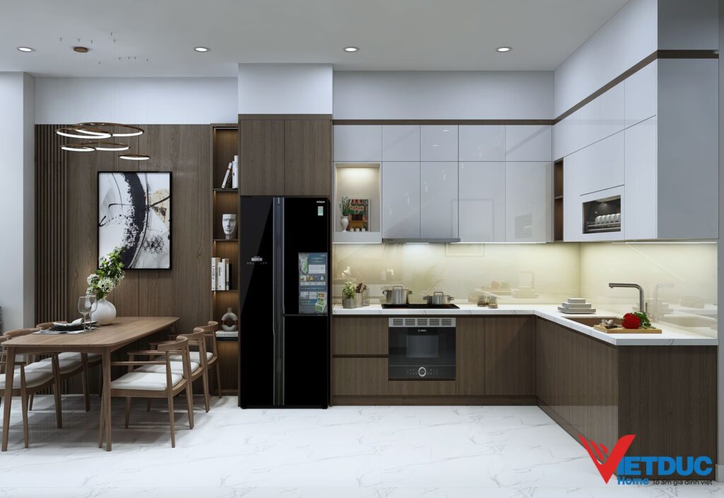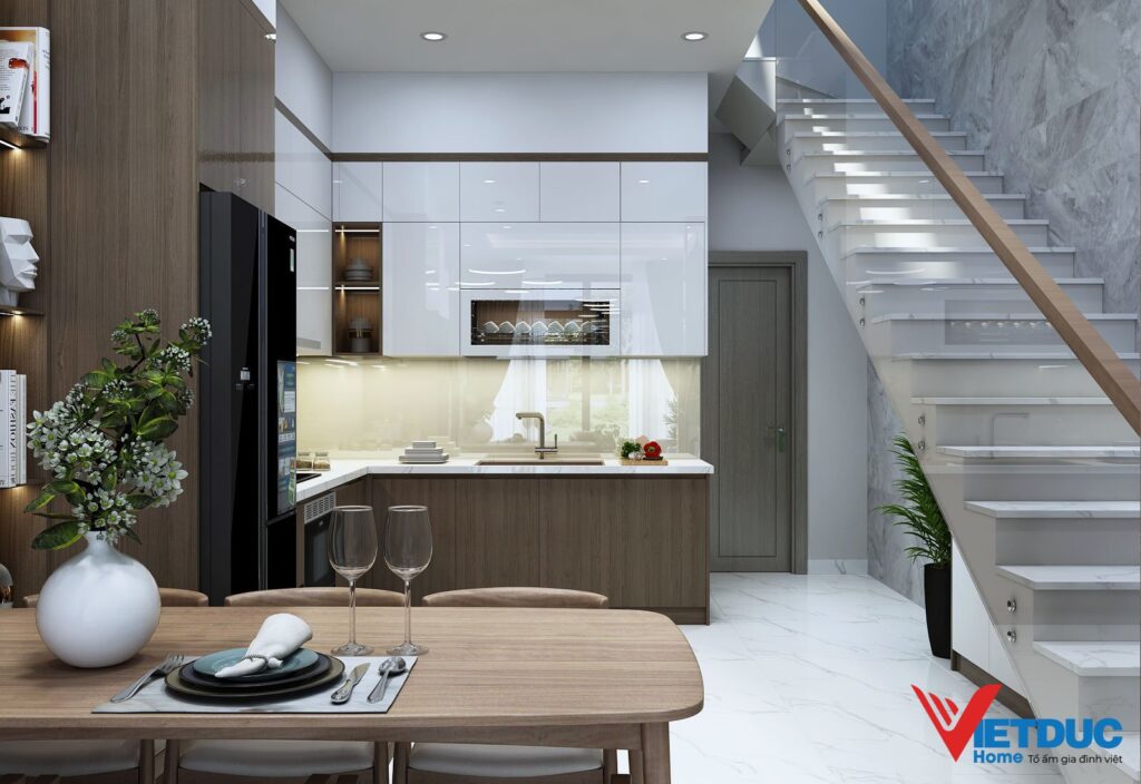 Phòng bếp được thiết kế theo phong cách hiện đại, tiện nghi với hệ thống tủ bếp chữ L, tích hợp đầy đủ thiết bị hiện đại. Bàn ăn được bố trí ngay cạnh cầu thang, tối ưu hóa diện tích sử dụng.