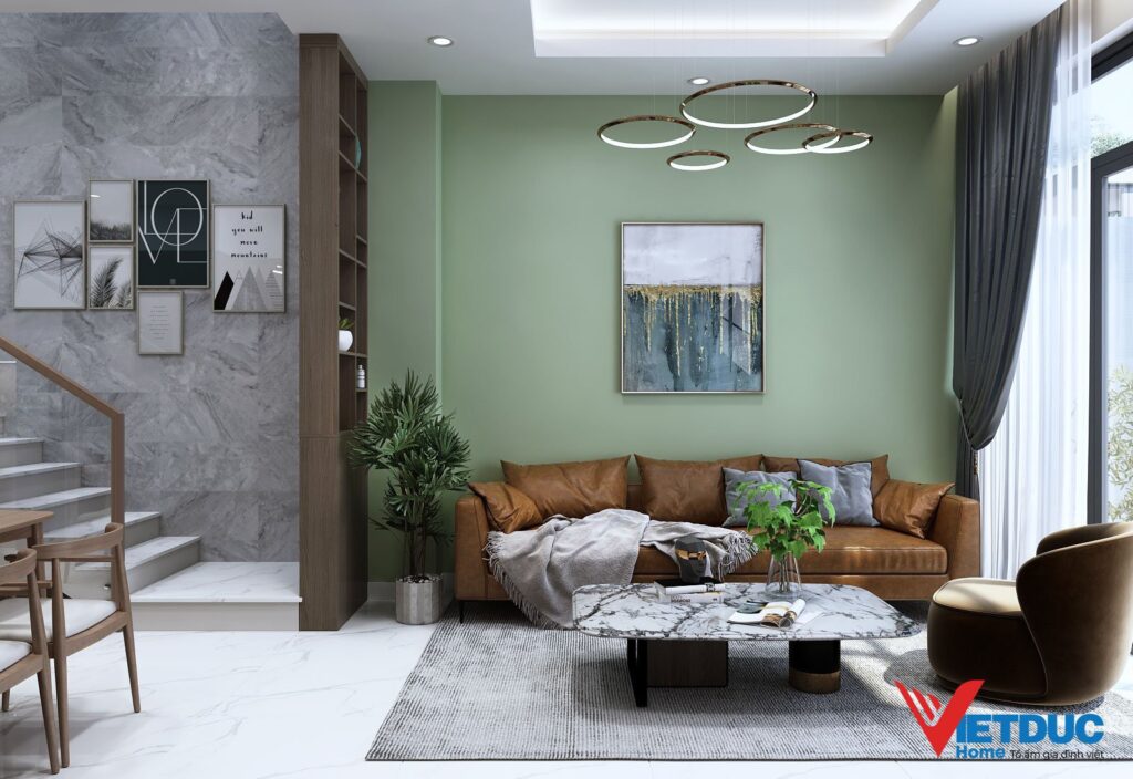 Phòng khách gây ấn tượng với mảng tường xanh cốm nổi bật, kết hợp cùng bộ sofa màu nâu da bò tạo nên điểm nhấn ấn tượng. Hệ thống đèn led âm trần cùng đèn chùm trang trí tinh tế mang đến nguồn ánh sáng ấm áp, dễ chịu cho toàn bộ không gian.
